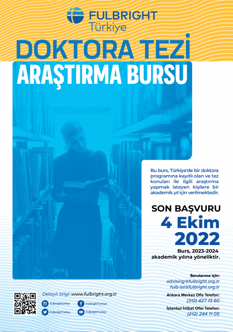 Başvurulara yeni açılmış olan Doktora Tez Araştırma Bursumuza, bir doktora programına kayıtlı ve tez konusunu belirlemiş olan ve A.B.D.’de tez konusu ile ilgili araştırma yapmak isteyen doktora öğrencileri başvuru yapabilirler. 2023-2024 akademik yılına yönelik verilecek Doktora Tezi Araştırma Bursuna son başvuru tarihi 4 Ekim 2022’dir.
