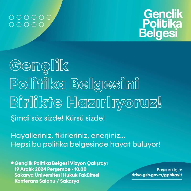 Gençlik Hizmetleri Genel Müdürlüğü'nün 25.11.2024 tarihli ve 9273095 sayılı yazısı gereği Gençlik ve Spor Bakanlığı tarafından araştırma temelli çalışmalara dayanan politikalar, gençlerin gelişimine katkıda bulunacak fırsatları sunarken, toplumun sürdürülebilir kalkınmasına da katkı sağlamayı hedeflemekte ve onları toplumsal yapının güçlü bir parçası haline getirmeyi amaçlayan kapsamlı bir yol haritası sunması doğrultusunda, ülkemiz gençlerine yönelik ulusal politikaların şekillenmesinde gençlerin aktif katılımını sağlamak ve görüşlerini doğrudan politika geliştirme sürecine dahil etmek amacıyla 19 Aralık 2024 Perşembe günü saat 10:00'da Sakarya Üniversitesi Hukuk Fakültesi Konferans Salonunda "Gençlik Politika Belgesi Vizyon Çalıştayları", ardından saat 13:00'da Sakarya Üniversitesi Genç Ofiste 11 politika alanında Atölye Çalışmaları düzenlenecektir.