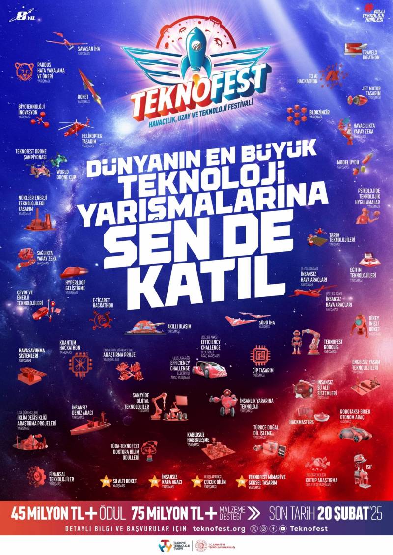 Türkiye Teknoloji Takımı Vakfı ve T.C. Sanayi ve Teknoloji Bakanlığı’nın yürütücülüğünde, Türkiye’nin önde gelen teknoloji şirketleri, kamu kurumları, medya kuruluşları ve üniversitelerin katkılarıyla düzenlenen TEKNOFEST Havacılık, Uzay ve Teknoloji Festivali, 2025 yılında İstanbul’da teknoloji severlerle buluşmaya hazırlanıyor. Festival coşkusunu ülkemizin her köşesine ulaştıran ve “ilklerin tek festivali” TEKNOFEST’in teknoloji yarışmalarına katılmak için www.teknofest.org adresinden başvurularınızı yapabilirsiniz.
