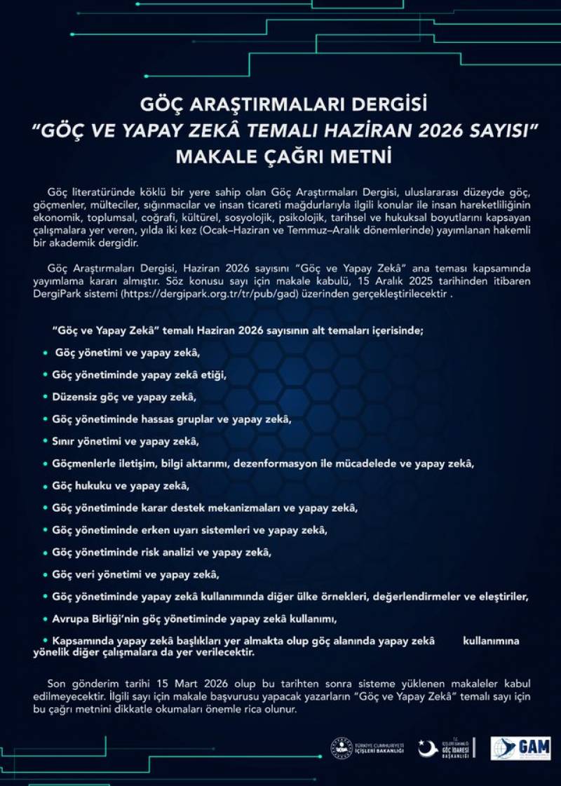 Göç Araştırmaları Dergisi, Haziran 2026 sayısını “Göç ve Yapay Zeka” ana teması kapsamında yayımlama kararı almıştır. Makale kabulü, 15 Aralık 2025 – 15 Mart 2026 tarihleri arasında DergiPark sistemi üzerinden gerçekleştirilecektir.