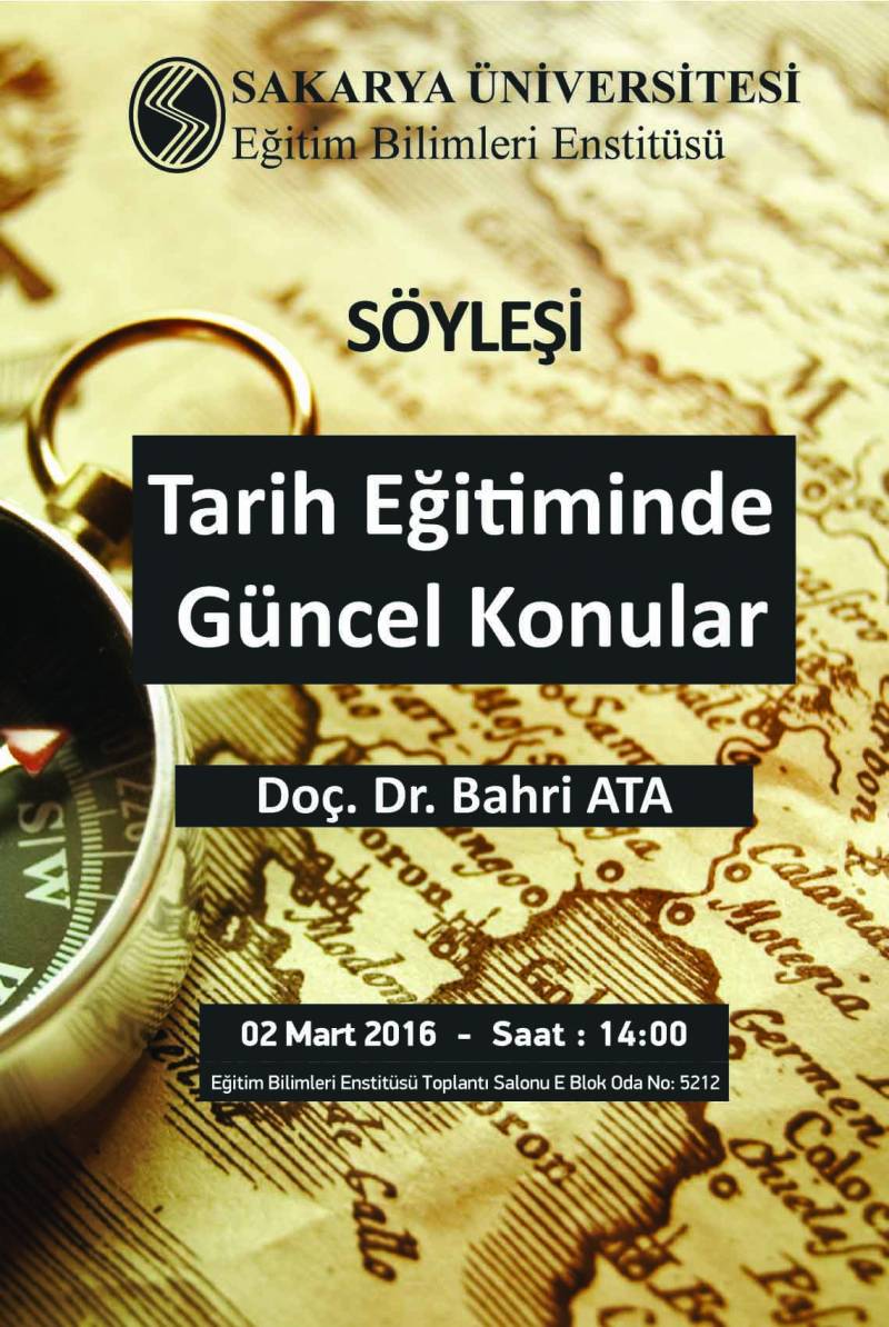 02.03.2016 tarihi saat 14:00'de Eğitim Bilimleri Enstitüsü Toplantı Salonunda (Oda No: 5212) Doç. Dr. Bahri ATA tarafından "Tarih Eğitiminde Güncel Konular" isimli söyleşi düzenlenecektir.